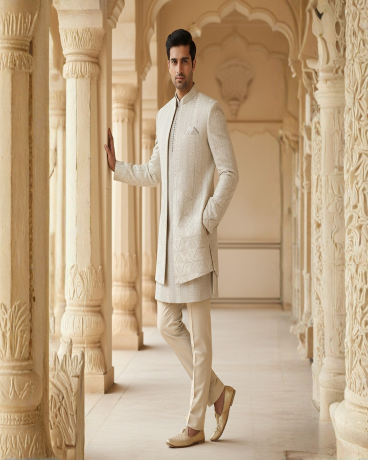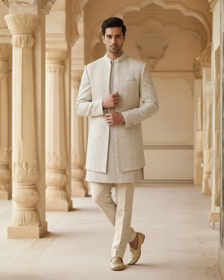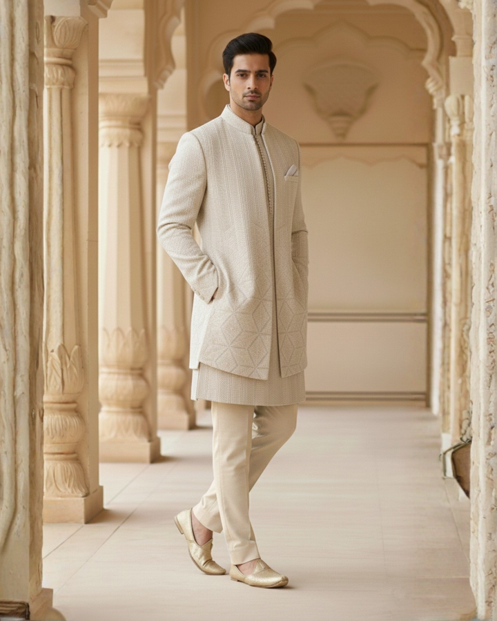 Grand Wedding Edit: Cream Textured Indo-Western Set