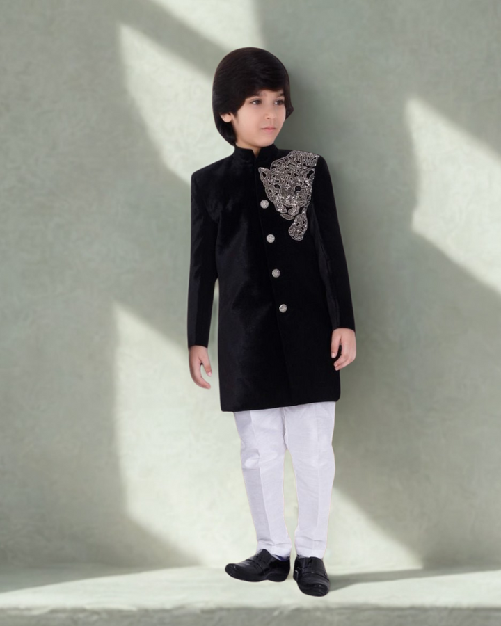 Majestic Black Velvet Sherwani with Royal Panther Motif