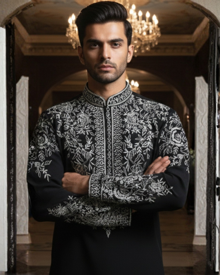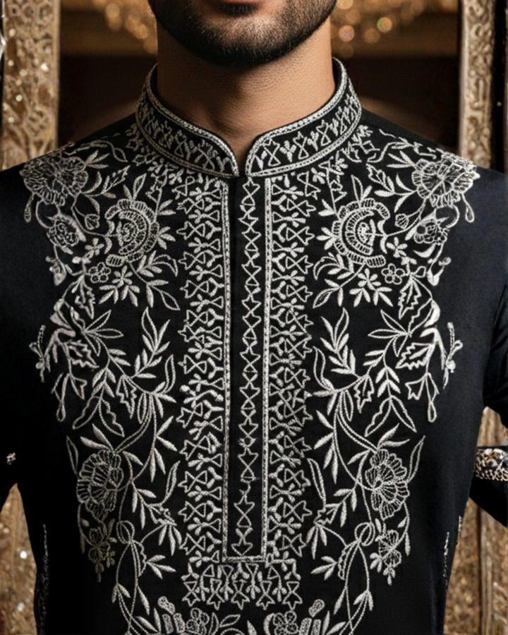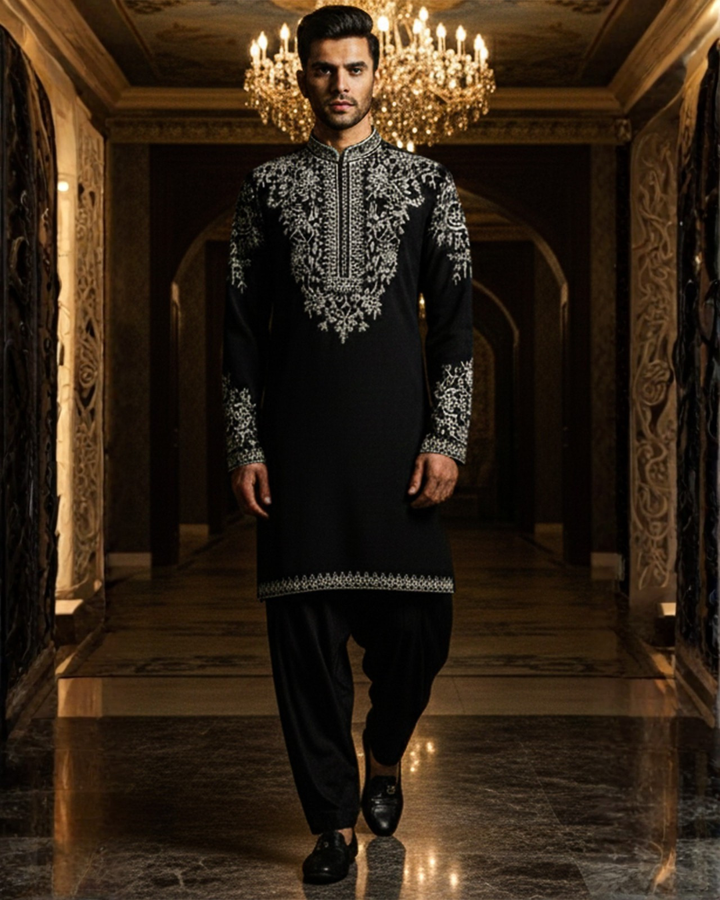 Royal Black Kurta Set with Exquisite Silver Detailing